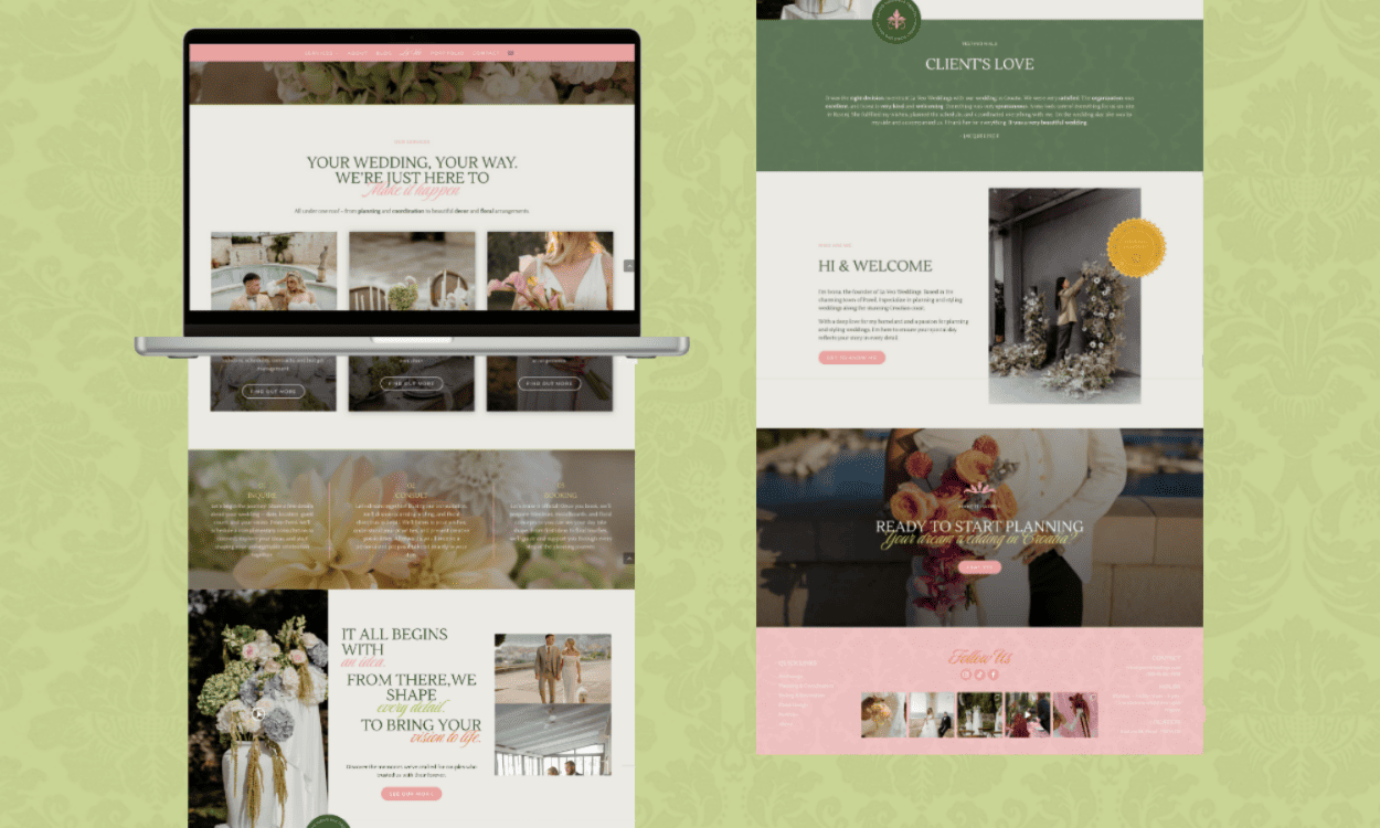 Posebno mjesto ima portfolio. To nije popis projekata, nego zbirka stvarnih dana, stvarnih emocija i stvarnih parova. Ideja je bila da se posjetitelj ne osjeća kao da gleda tuđi album, nego da se može zamisliti u toj priči.